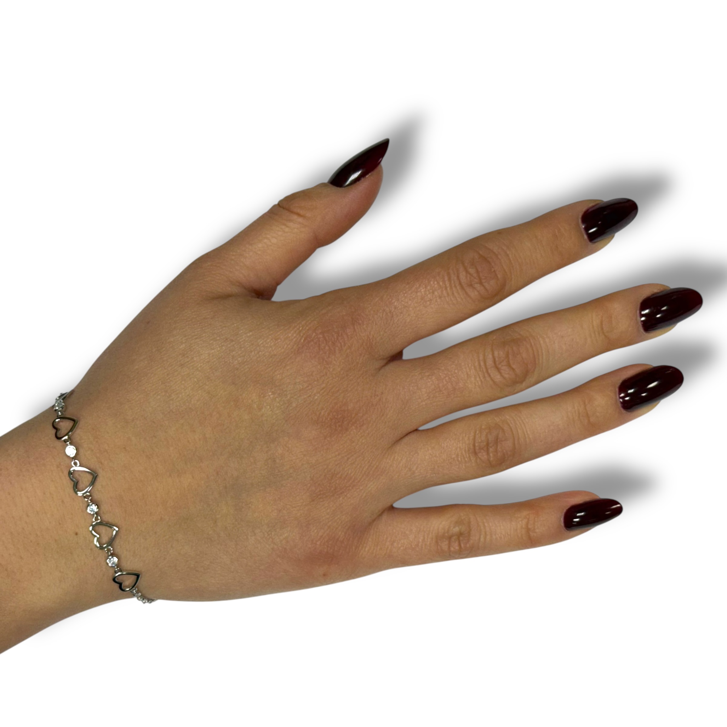 Bracciale da donna in argento 925 con 5 cuoricini lisci e cipollini zircvonati. Lunghezza 16 cm + 3 cm di allungo. Chiusura a moschettone regolabile