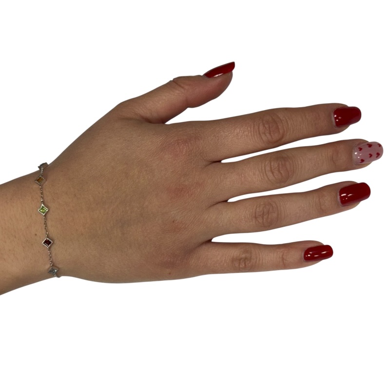 Bracciale da donna in argento 925 con rombi impreziositi da zirconi quadrati colorati. Lunghezza 16 cm più 3 cm di allungo. Chiusura con moschettone regolabile