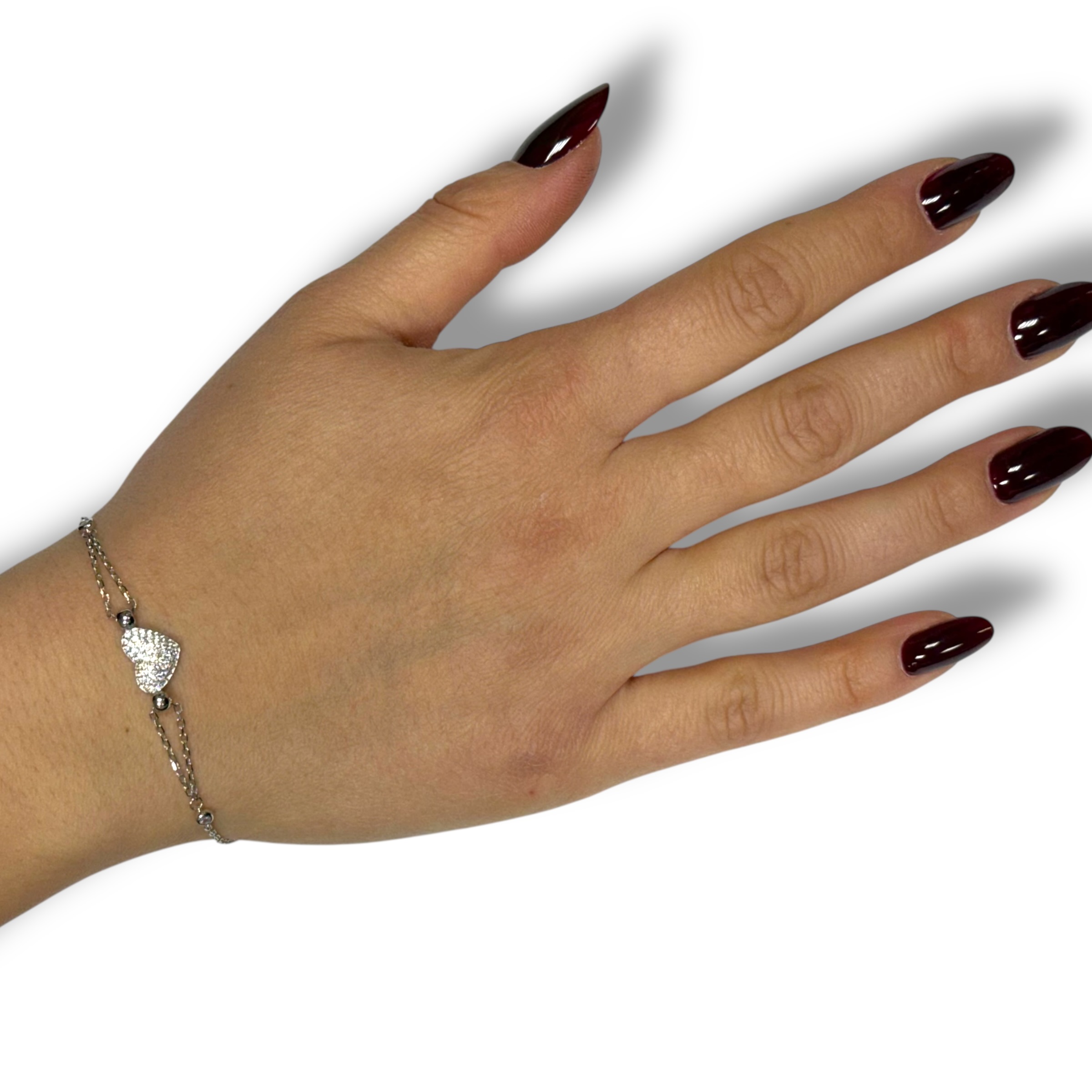 Bracciale in argento 925 con doppio filo e cuore centrale cuore bombato zirconato. Chiusura a moschettone regolabile lunghezza 16 cm + 3 cm di allungo