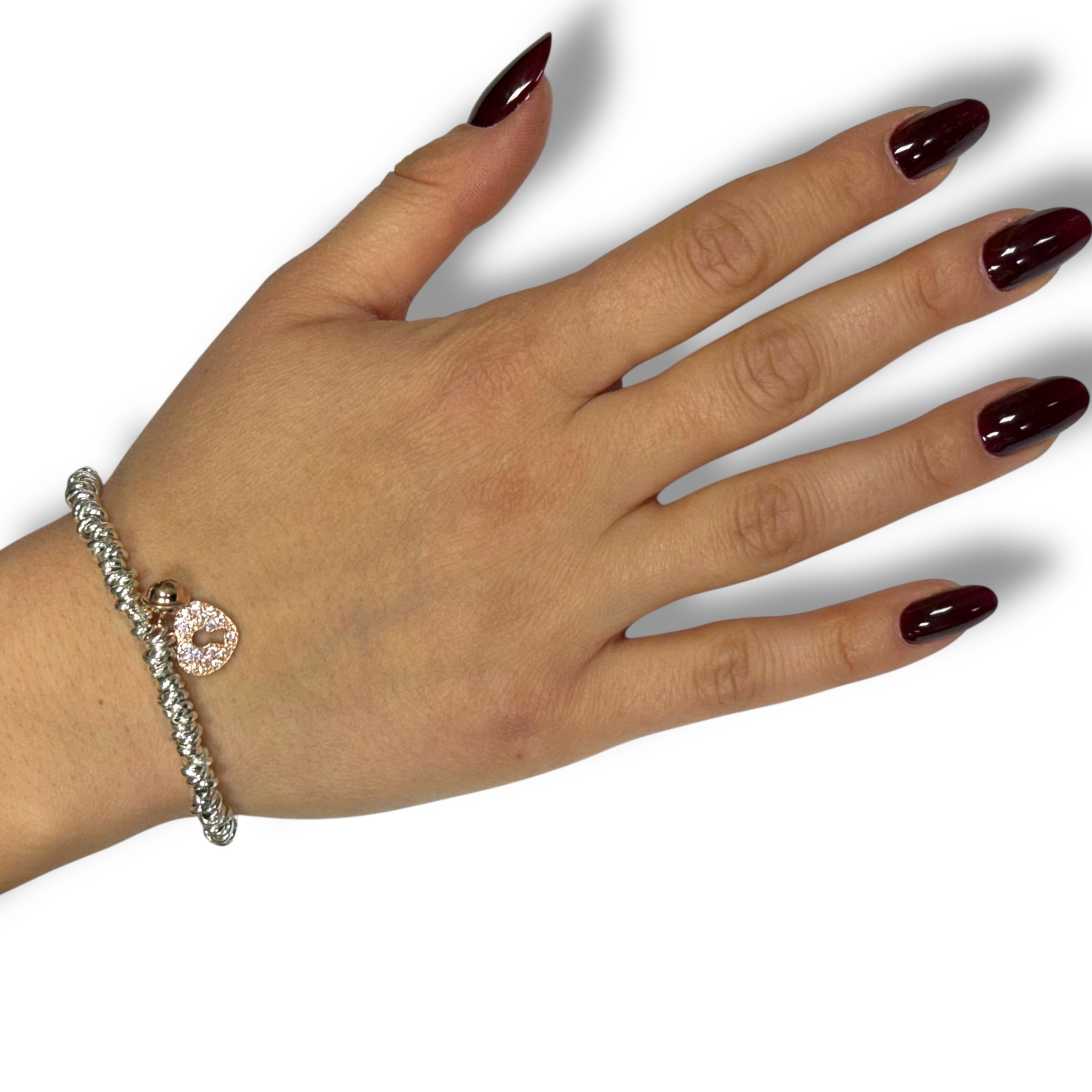 Bracciale femminile in argento 925 bicolore con charms a forma di lucchetto brillantinato oro rosa e campanellina con chiusura regolabile a moschettone.