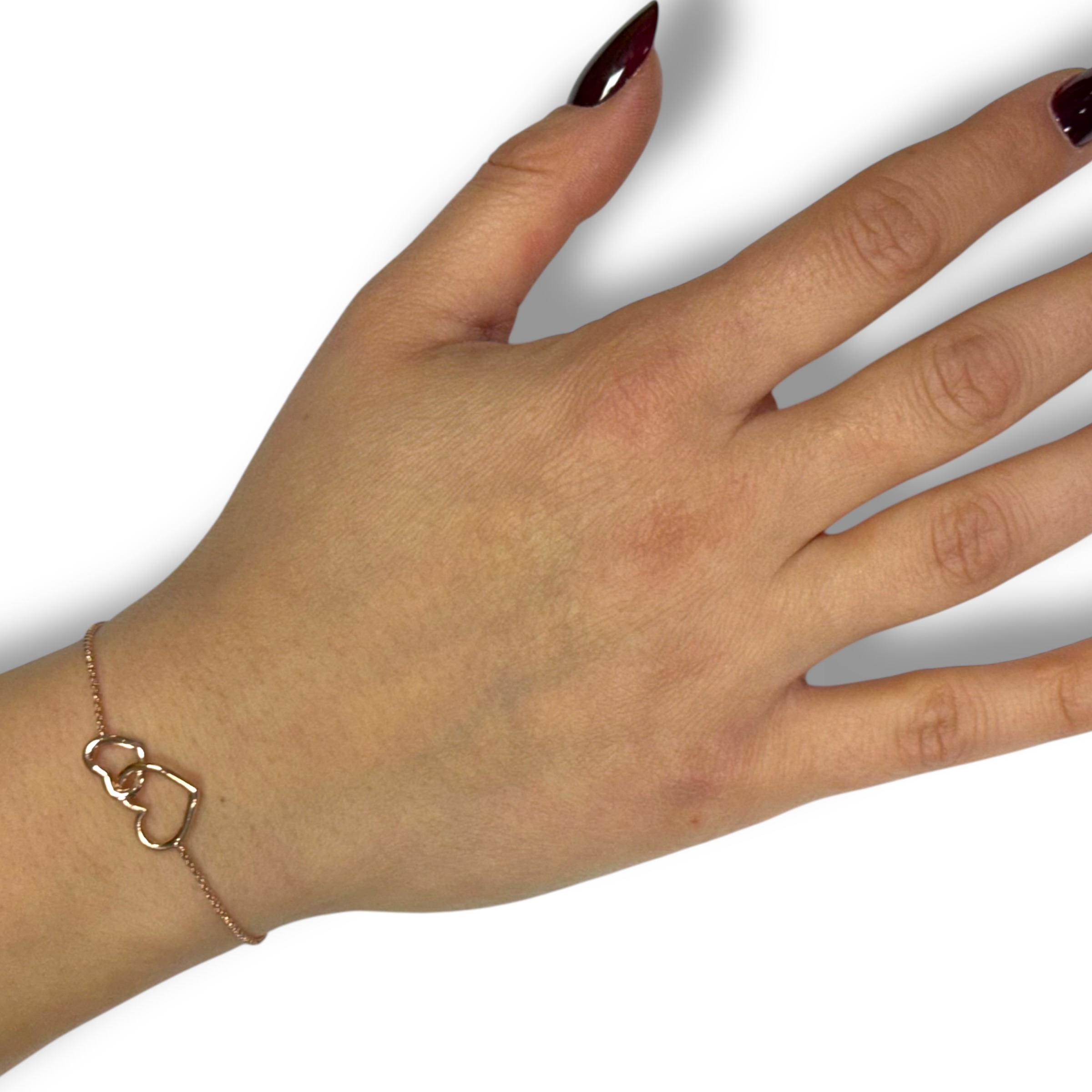 Bracciale da donna in argento 925 composto da due cuori incatenati. Misura 16 cm + 4 cm di allungo. Chiusura a moschettone regolabile