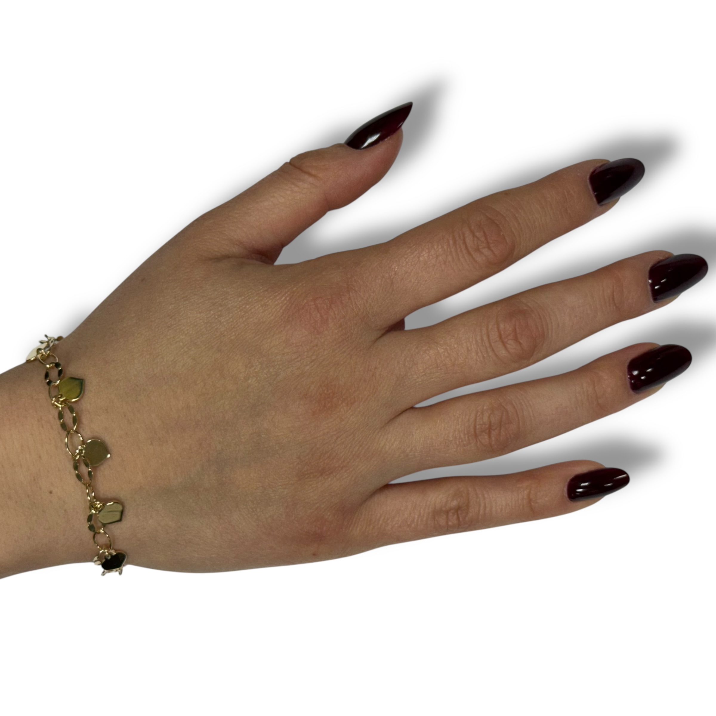 Bracciale da donna in argento 925 colore gold con con 9 charms a forma di cuore. Chiusura a molla regolabile. Misura 17 cm + 3 cm di allungo.