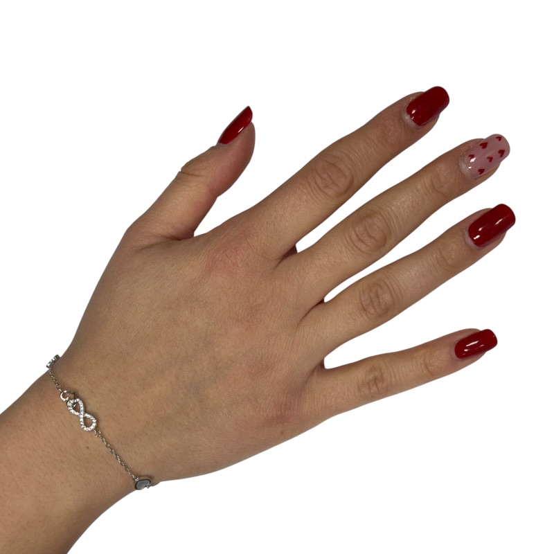 Bracciale da donna in argento 925 con simbolo dell’infinito zirconato e cuoricini madreperlati. Lunghezza 16 cm + 3 cm di allungo. Chiusura a moschettone regolabile