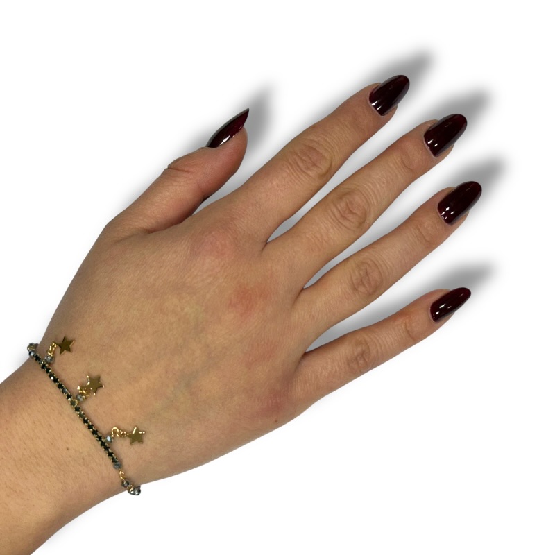 Bracciale da donna in argento 925 con perline sfaccettate, tennis centrale e tre stelline pendenti. Misura 16,5 cm + 3,5 cm di allungo. Chiusura a moschettone regolabile