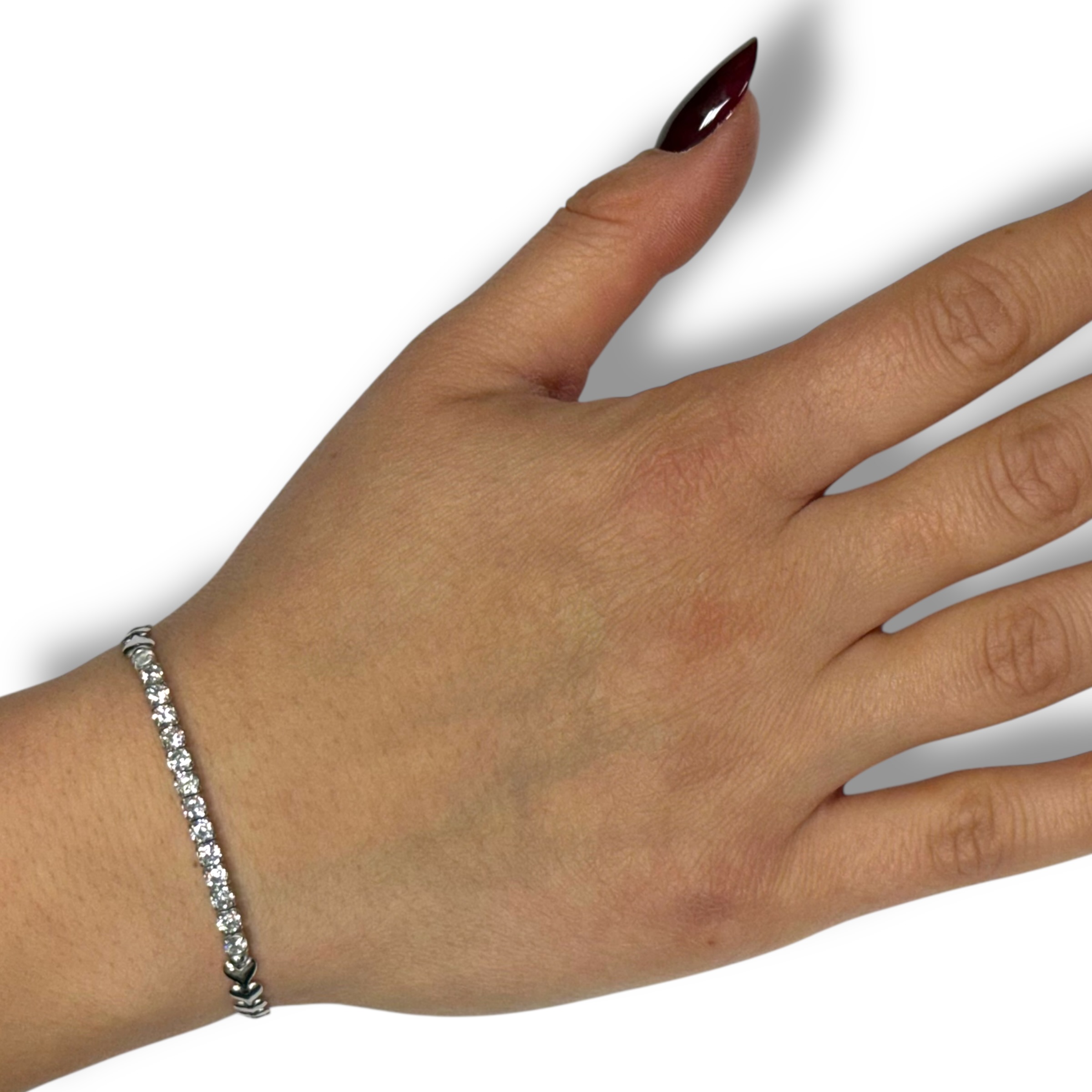 Bracciale da donna in argento 925 modello mezzo tennis con cuori. Chiusura a moschettone regolabile. Misura 17 cm + 3 cm di allungo.