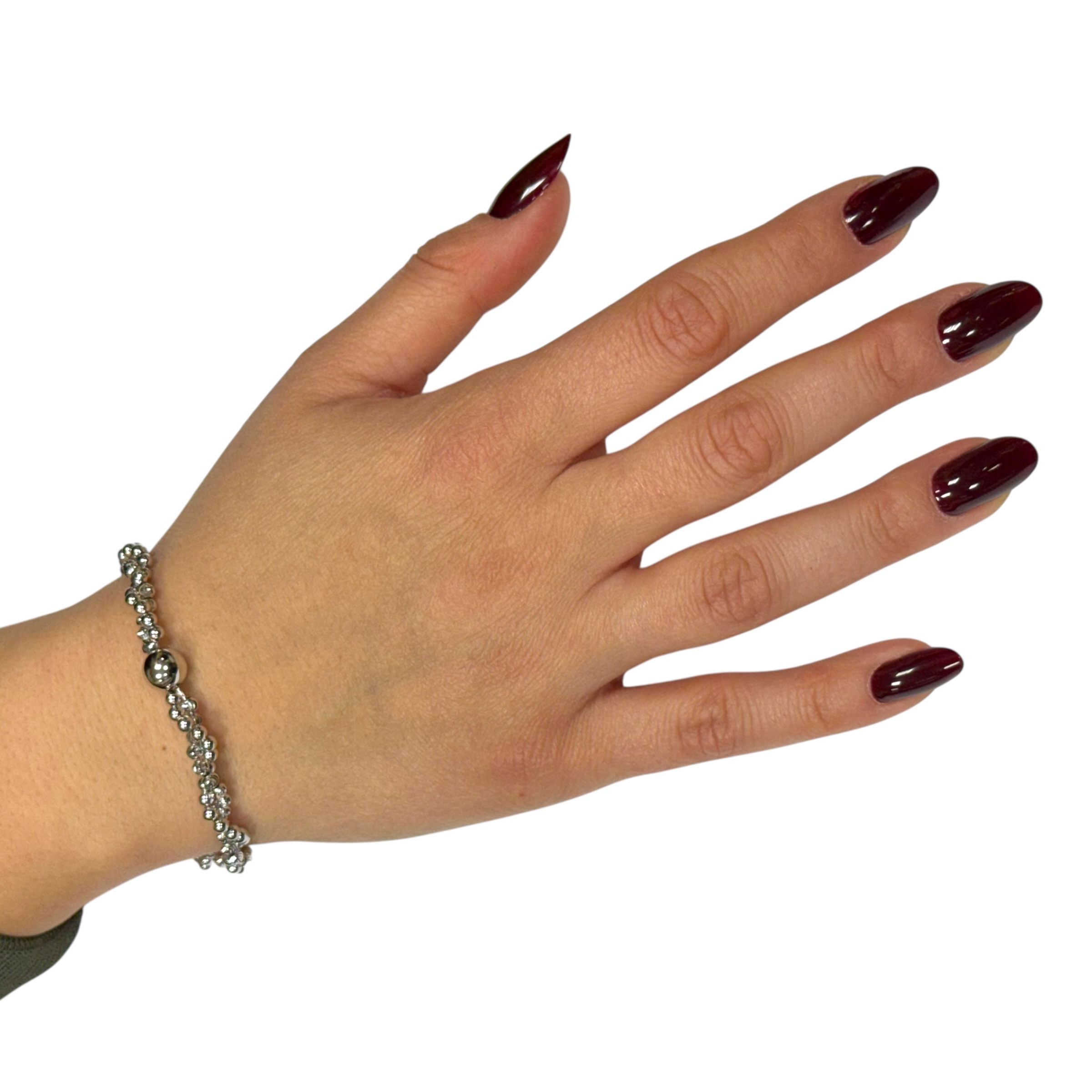 Bracciale in argento 925 milleluci con sfera lucida e sfere piccole lisce e zicrinate. Lunghezza 16 cm + 3 cm di allungo. Chiusura a moschettone regolabile