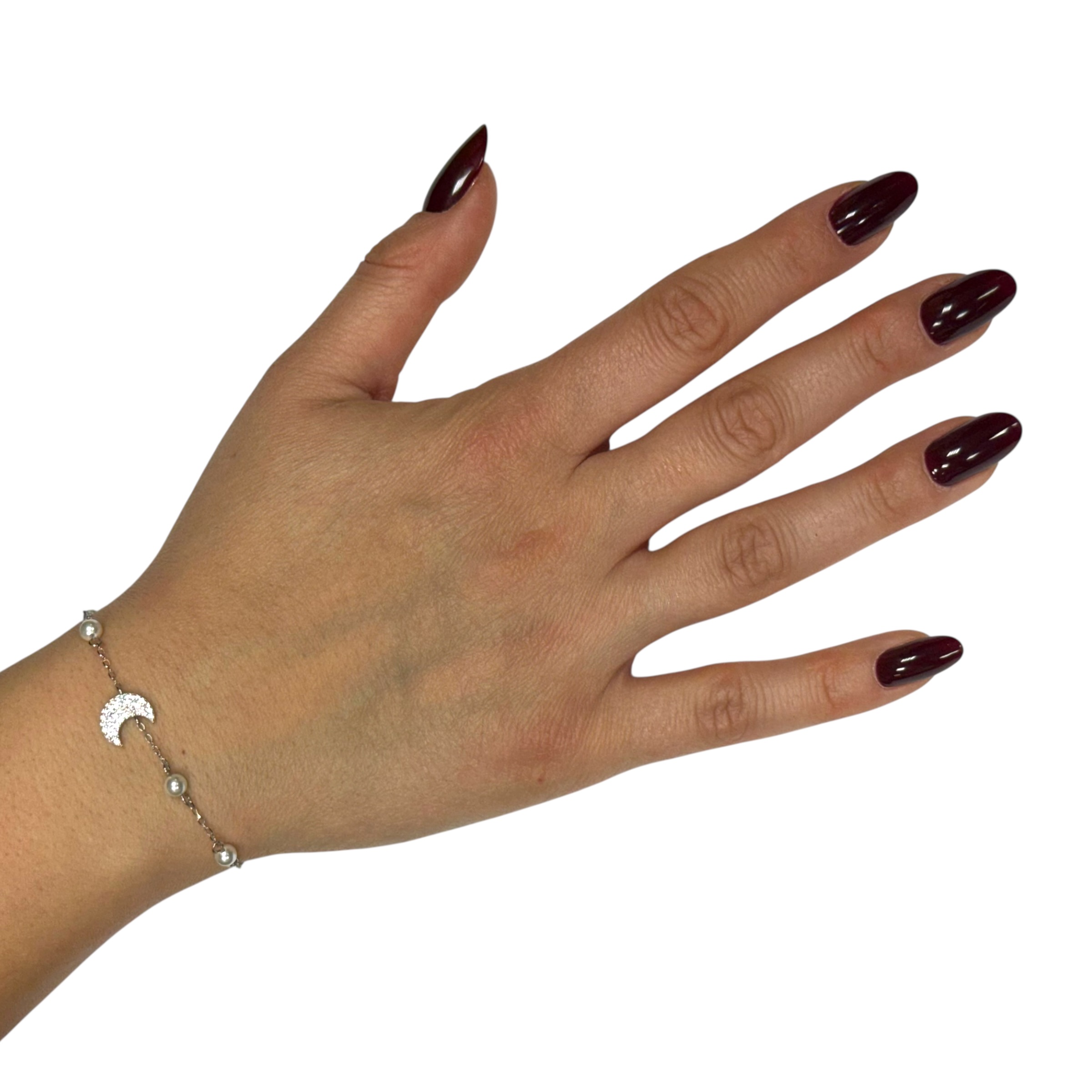 Bracciale da donna in argento 925 con perline e luna centrale zirconata. Lunghezza 16 cm più 3 cm di allungo. Chiusura con moschettone regolabile