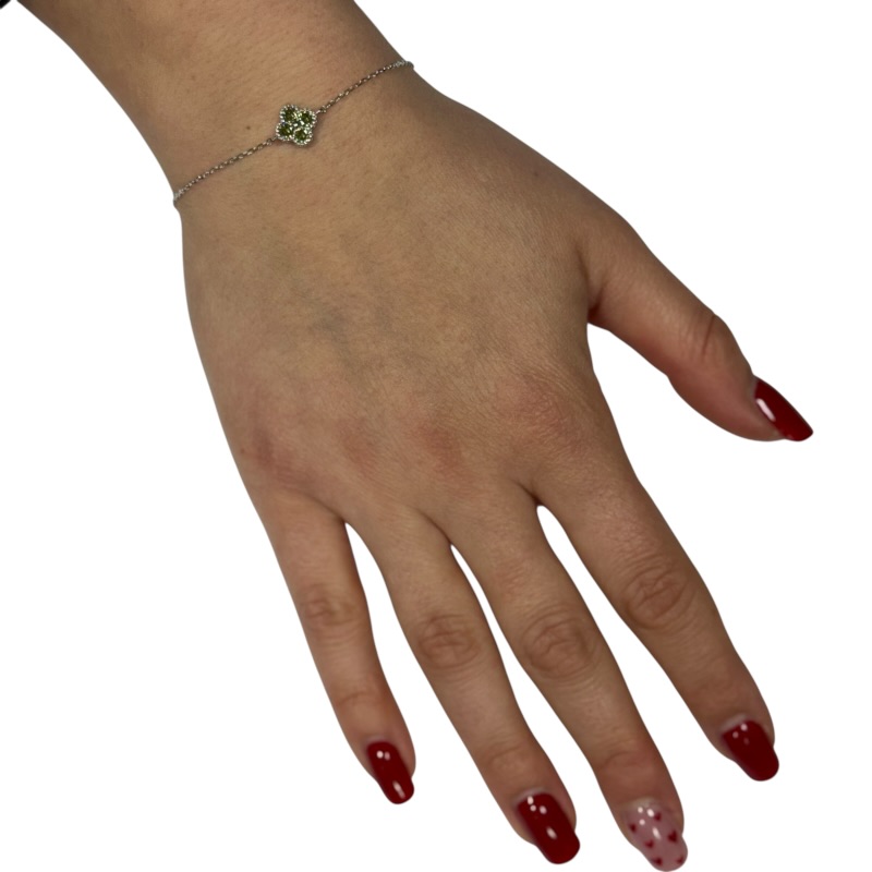 Bracciale da donna con quadrifoglio centrale impreziosito da zirconi lunghezza 16 cm + 3 cm di allungo. Chiusura a moschettone regolabile.