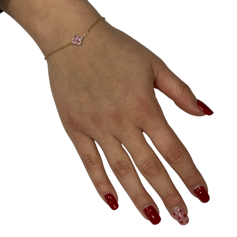 Bracciale da donna con quadrifoglio centrale impreziosito da zirconi lunghezza 16 cm + 3 cm di allungo. Chiusura a moschettone regolabile.