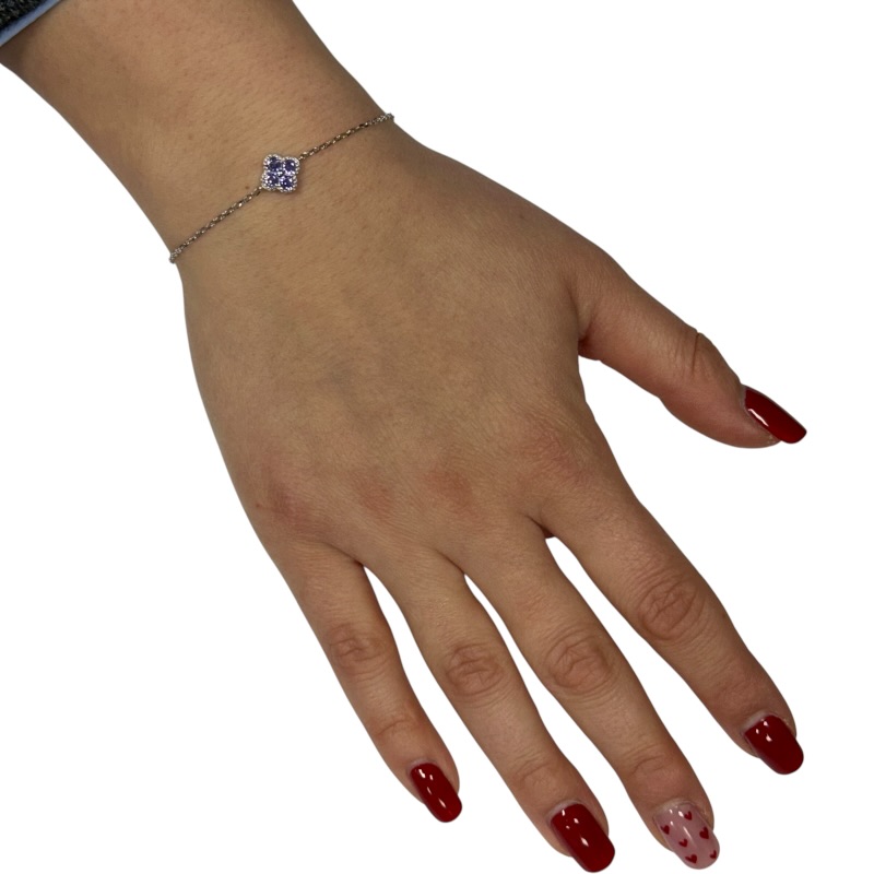 Bracciale da donna con quadrifoglio centrale impreziosito da zirconi lunghezza 16 cm + 3 cm di allungo. Chiusura a moschettone regolabile.