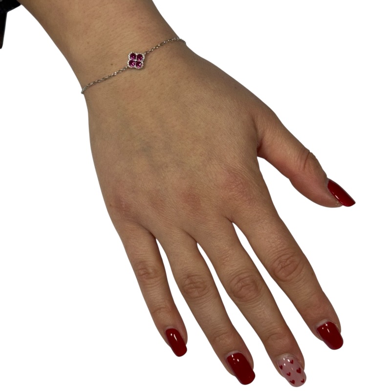 Bracciale da donna con quadrifoglio centrale impreziosito da zirconi lunghezza 16 cm + 3 cm di allungo. Chiusura a moschettone regolabile.