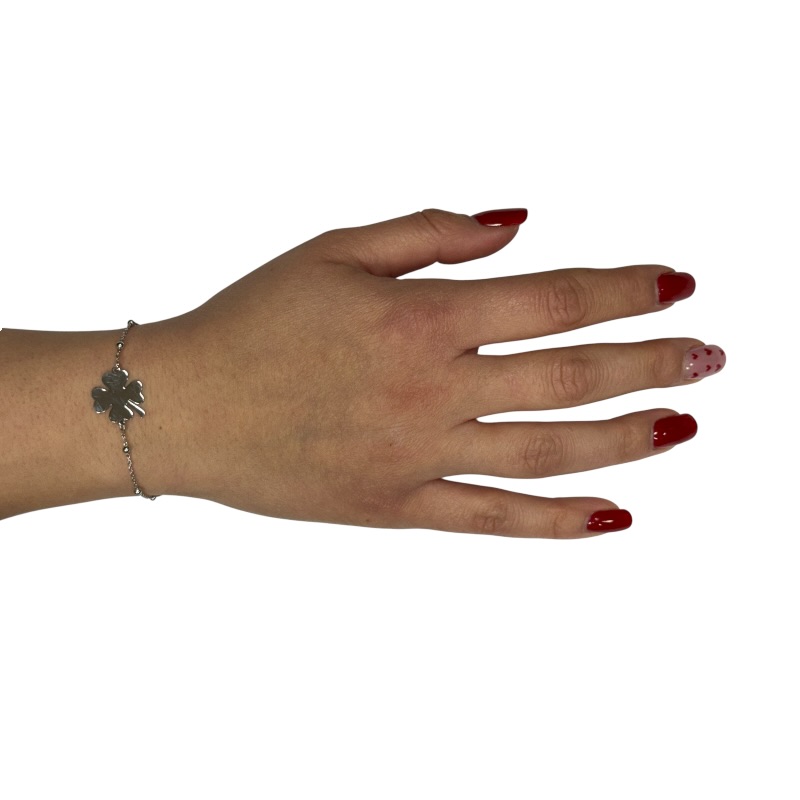 Bracciale da donna in argento 925 con catena alternata a sferette lisce e quadrifoglio centrale. Chiusura a moschettone regolabile
