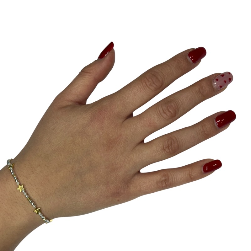 Bracciale da donna in argento 925 con sfere zigrinate e 7 stelline dorate. Lunghezza 16 cm + 5 cm di allungo. Chiusura a moschettone regolabile