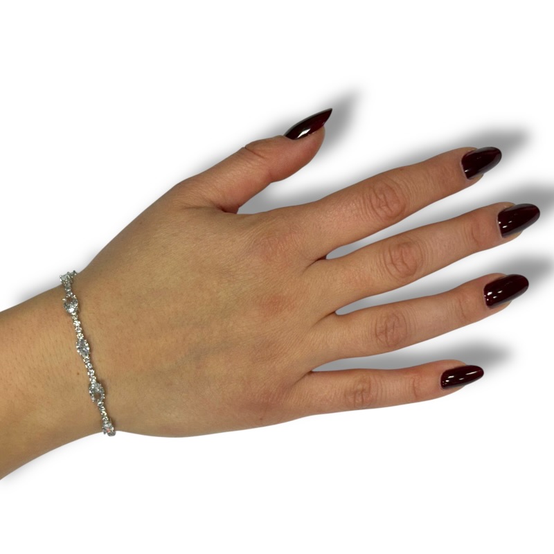 Bracciale in argento 925 maglia tennis con zirconi ovali. Lunghezza 16 cm + 3 cm di allungo. Chiusura a moschettone regolabile