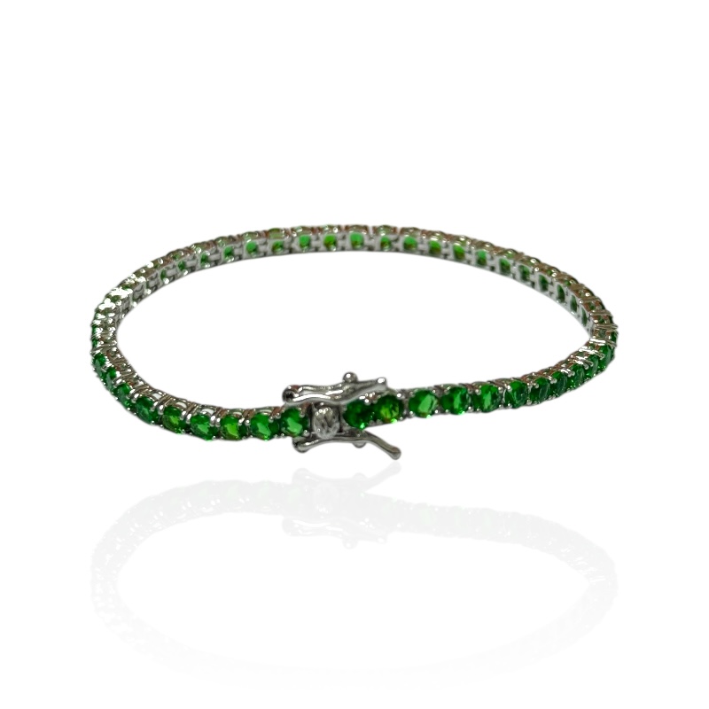 Bracciale da donna in argento 925 modello tennis con zirconi verdi da 3 mm, lunghezza 16 cm. Chiusura a cassetto