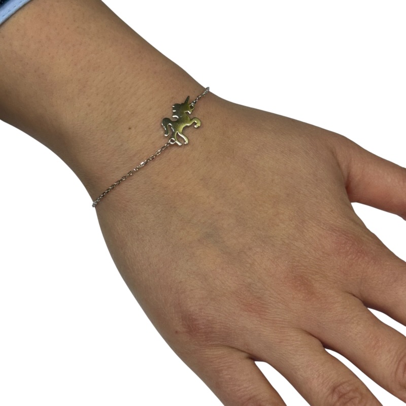 Bracciale forzatina da donna in argento 925 con unicorno plain silver centrale. Chiusura a moschettone regolabile . misura 16 + 3 cm di allungo