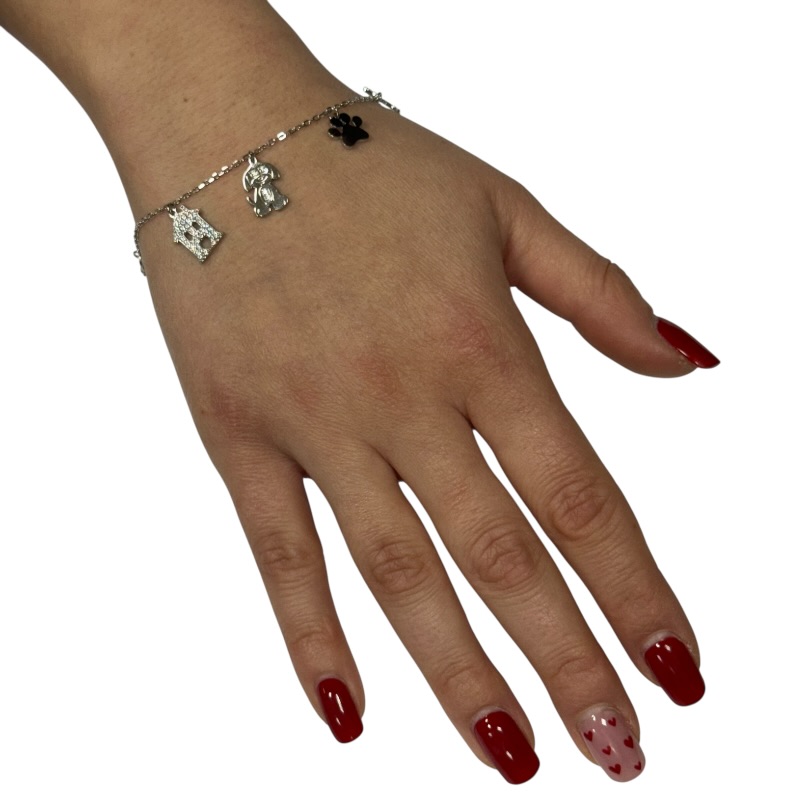 Bracciale da donna in argento 925 con cani, zampa, osso e casetta con zirconi. Lunghezza 16 cm + 3 cm di allungo. Chiusura a moschettone regolabile