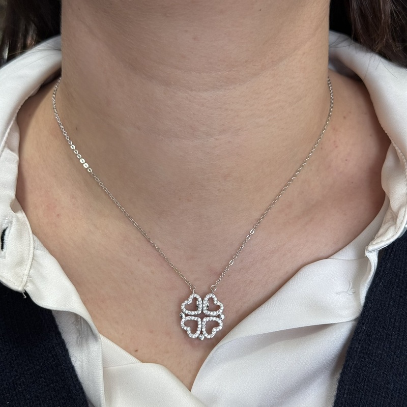 Collana da donna in argento 925 con pendente a 4 cuori trasformabile in quadrifoglio zirconato. Chiusura a moschettone regolabile