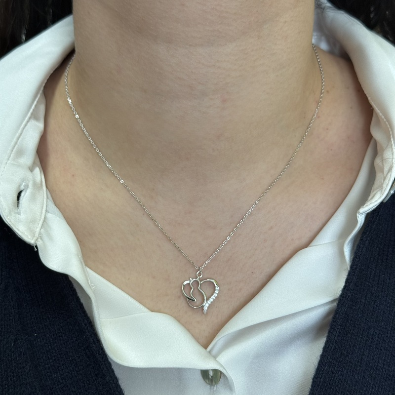 Collana da donna in argento 925 con pendente a forma di cuore e sagoma del gatto e zirconi. Chiusura a moschettone regolabile