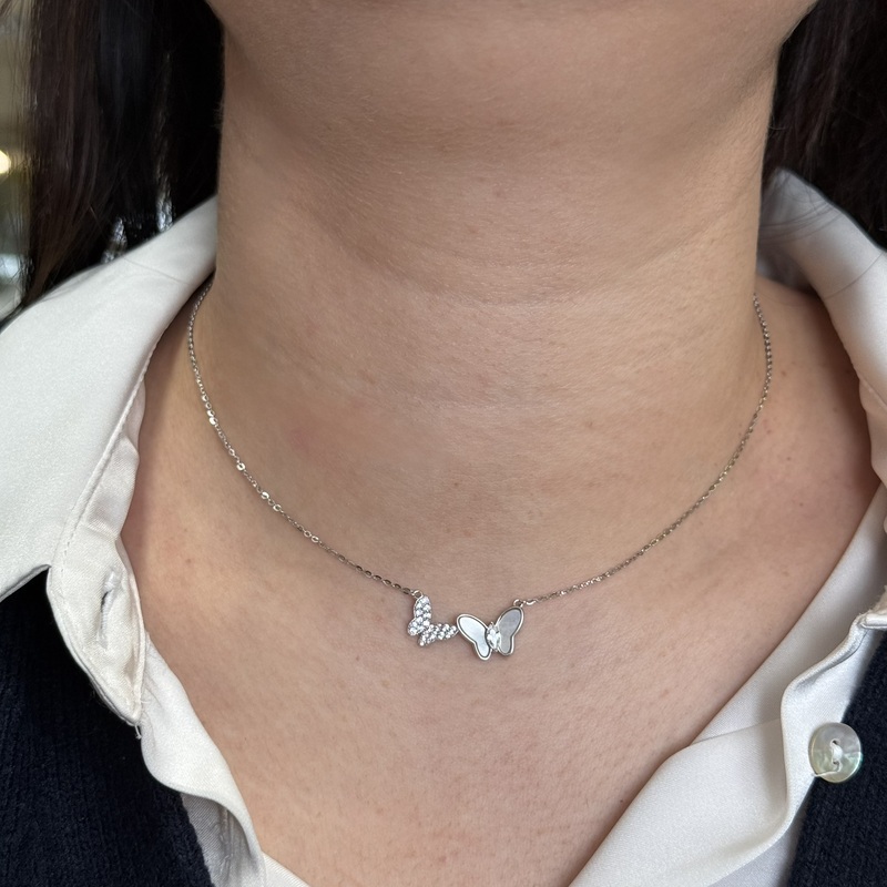 Collana da donna in argento 925 con due farfalline di dimensioni diverse, una zirconata ed un’altra madreperla. Chiusura a moschettone regolabile
