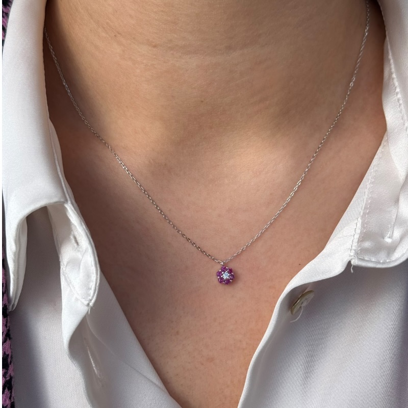 Collana da donna in argento 925 con pendente a forma di fiorellino impresiozito da zirconi colorati. Chiusura a moschettone regolabile