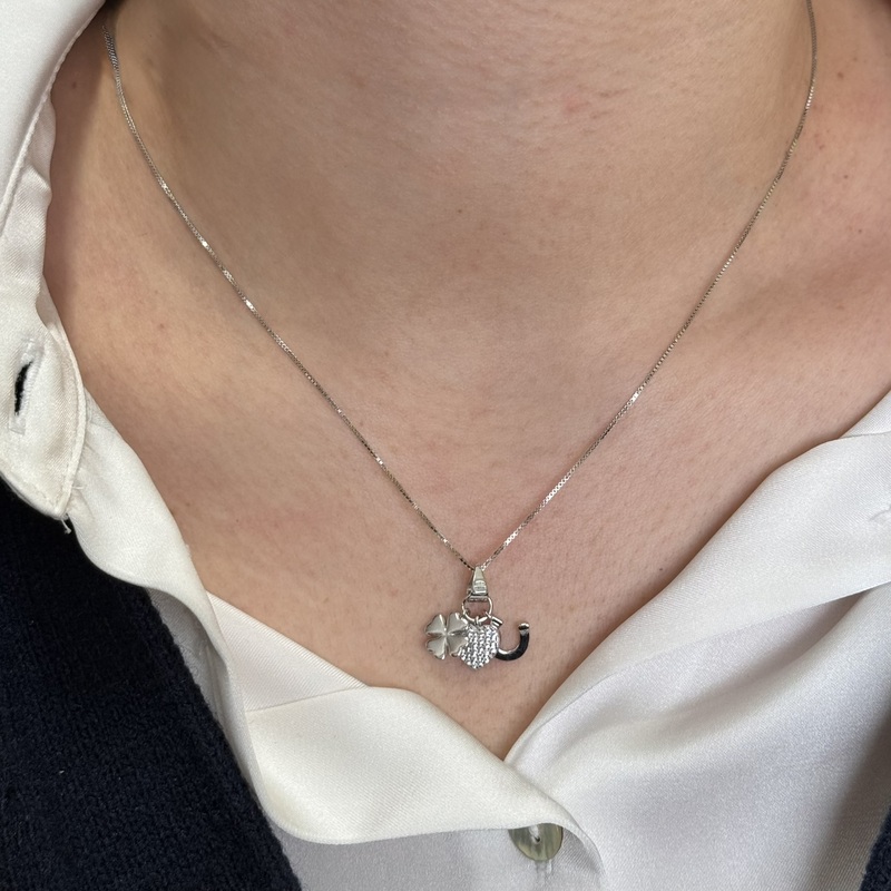 Collana da donna in argento 925 con pendente a forma di cuore zirconato, ferro di cavallo e quadrifoglio. Chiusura a moschettone