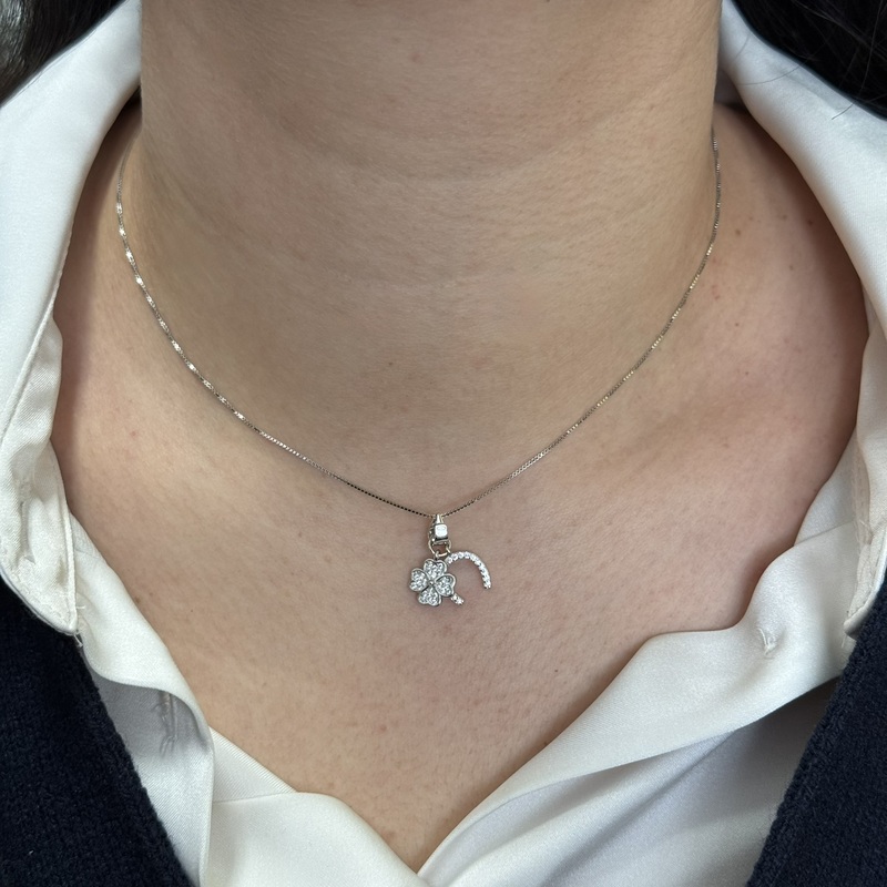 Collana in argento 925 con ferro di cavallo e quadrifoglio zirconati. Chiusura a moschettone regolabile