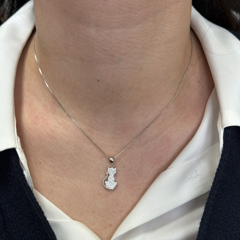 Collana da donna in argento 925 con pendente a forma di gattino impreziosito da zirconi. chiusura a molla regolabile