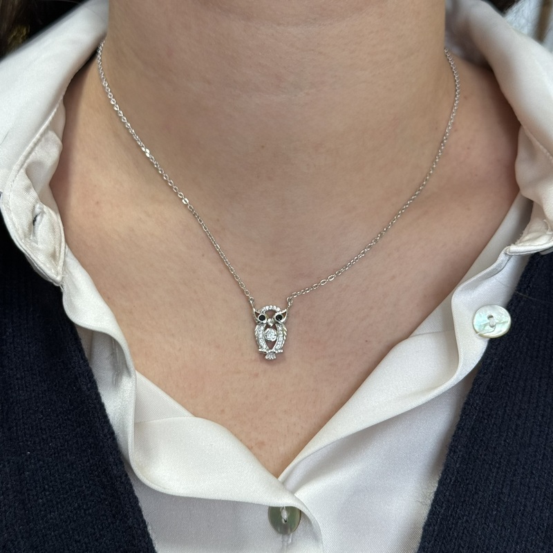 Collana da donna in argento 925 con gufo zirconato. Lunghezza 42 cm + 3 cm di allungo. Chiusura a moschettone regolabile.