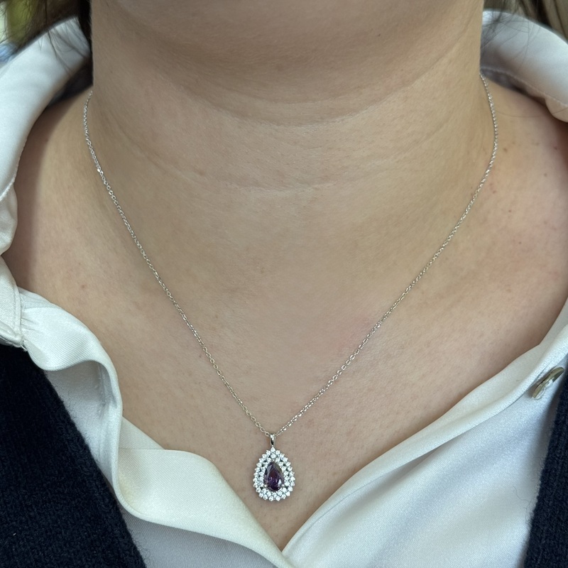Collana da donna in argento 925 con pendente a forma di goccia impreziosito da zircone colorato. Chiusura a moschettone regolabile