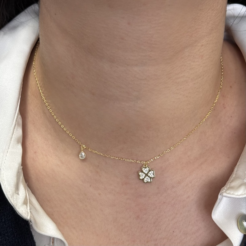 Collana da donna in argento 925 con goccia pendente e quadrifoglio zirconato. Lunghezza 42 cm + 3 cm di allungo. Chiusura a moschettone regolabile