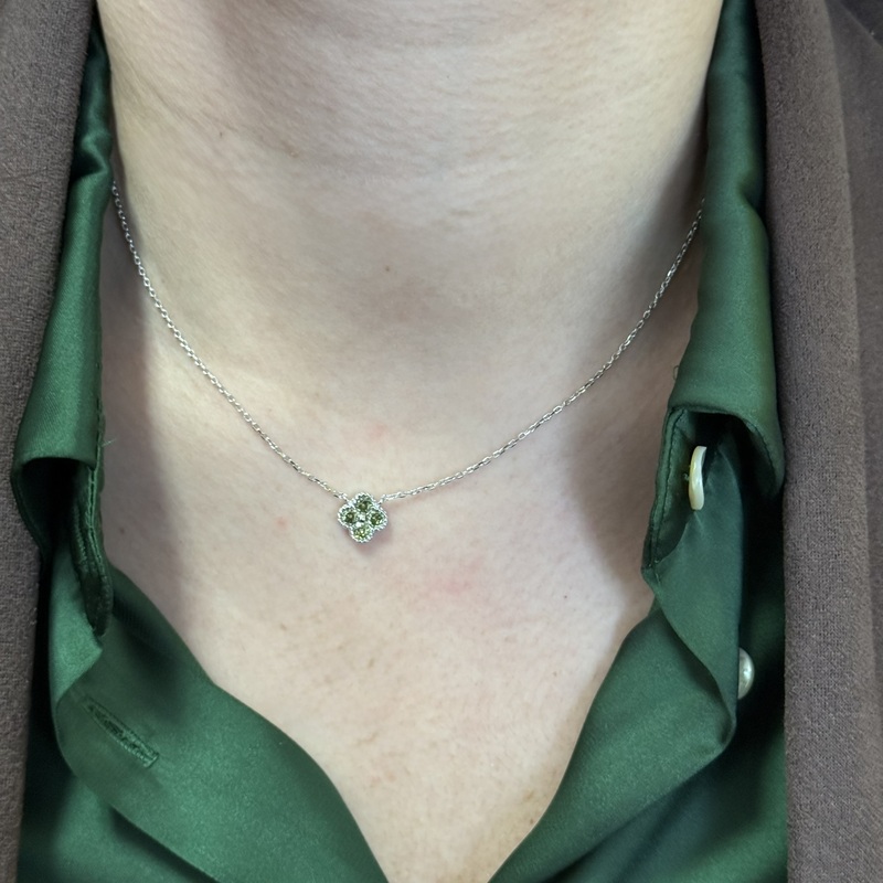 Collana in argento 925 con pendente a forma di quadrifoglio zirconato. Chiusura a moschettone regolabile Lunghezza 40 cm + 5 cm di allungo.