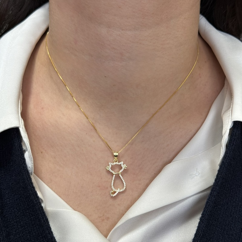 Completo in argento 925 con pendente a forma di sagoma di gattino impreziosito da zirconi. Chiusura a moschettone regolabile