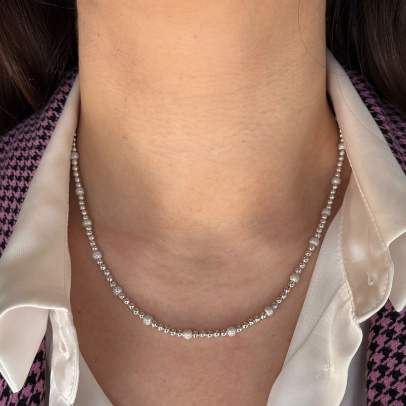 Collana da donna in argento 925 con sfere lucide e sfere satinate. Chiusura a moschettone regolabile