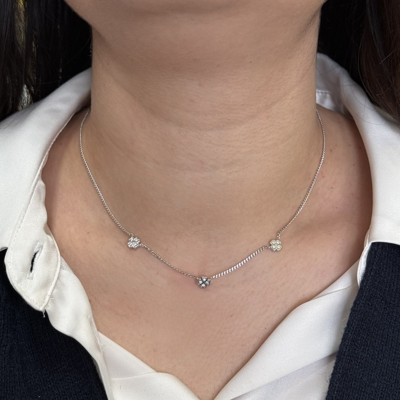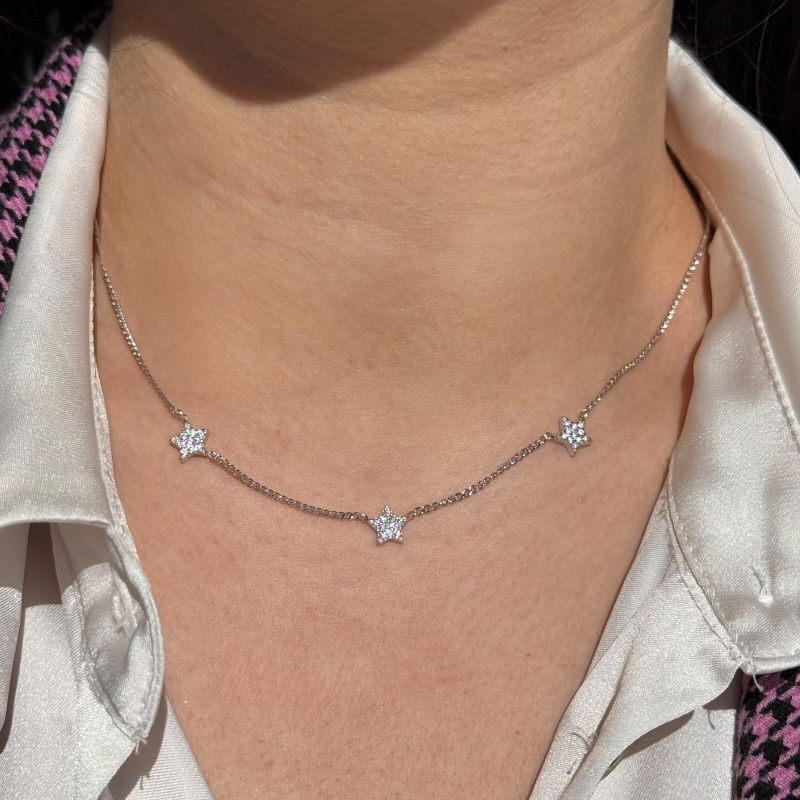 Collana da donna in argendo 925 con catena groumette e 3 elementi impreziositi da strass.Chiusura a moschettone regolabile. Misura: 42 cm + 4 cm di allungo