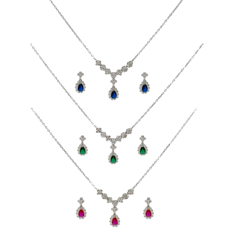 Completo composto da collana ed orecchini con zircone a goccia colorato e fiori zirconati.