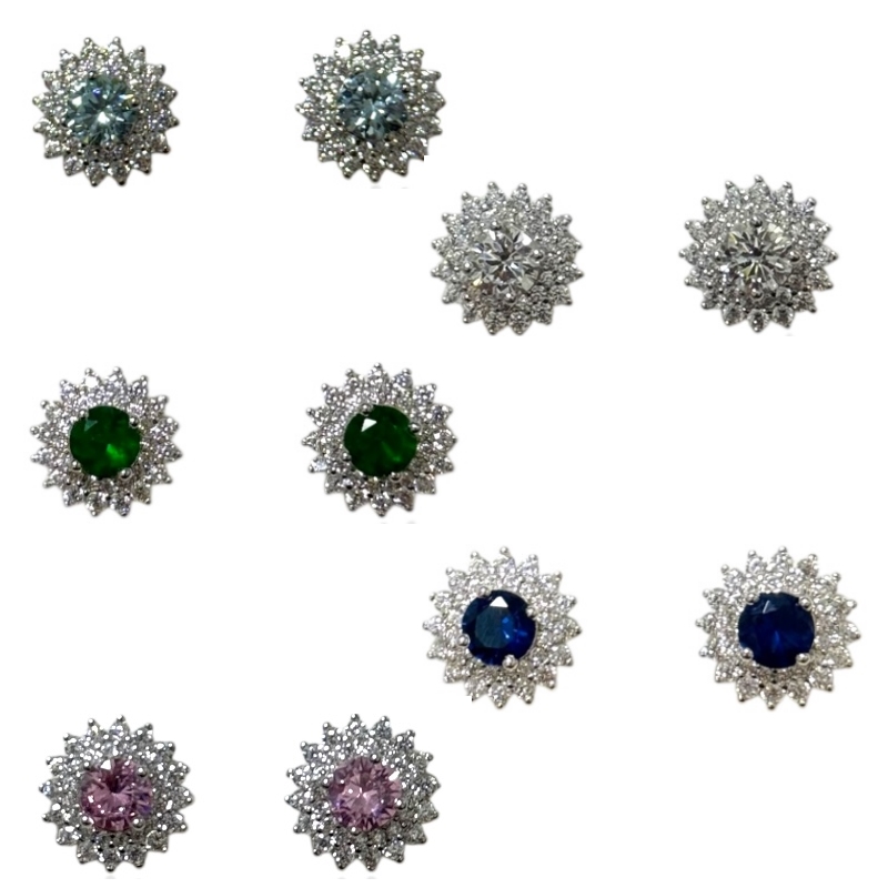 Orecchini da donna in argento 925 impreziositi da zircone colorato centrale tondo contorno di zirconi bianchi. Chiusura perno.