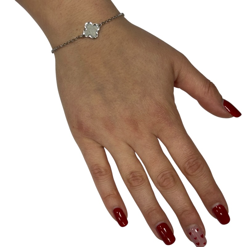 Bracciale da donna in argento 925 modello quadrifoglio fantasi con fondo chiaro e scuro. Chiusura a moschettone regolabile