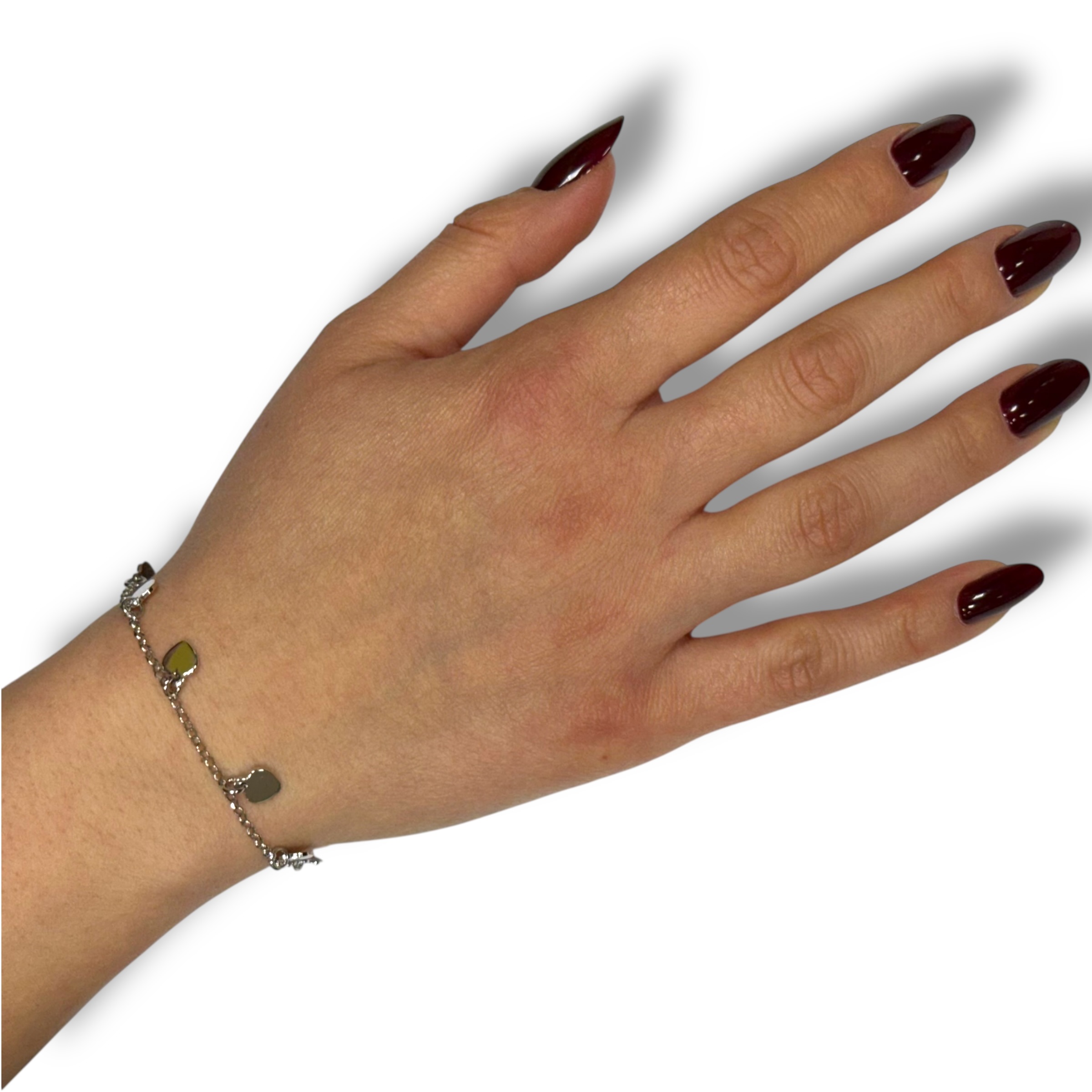 Bracciale da donna in argento 925 con 5 cuoricini lucidi pendenti. Chiusura a moschettone regolabile. Misura 17 cm + 3 cm di allungo.