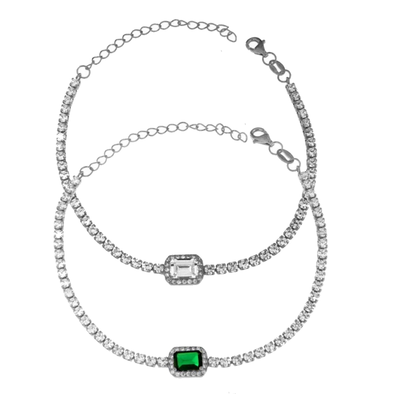 Bracciale in argento 925 modello tennis con zircone rettangolare centrale 2.5m. Lunghezza 17 cm + 5 cm di allugo. Chiusura a moschetone regolabile